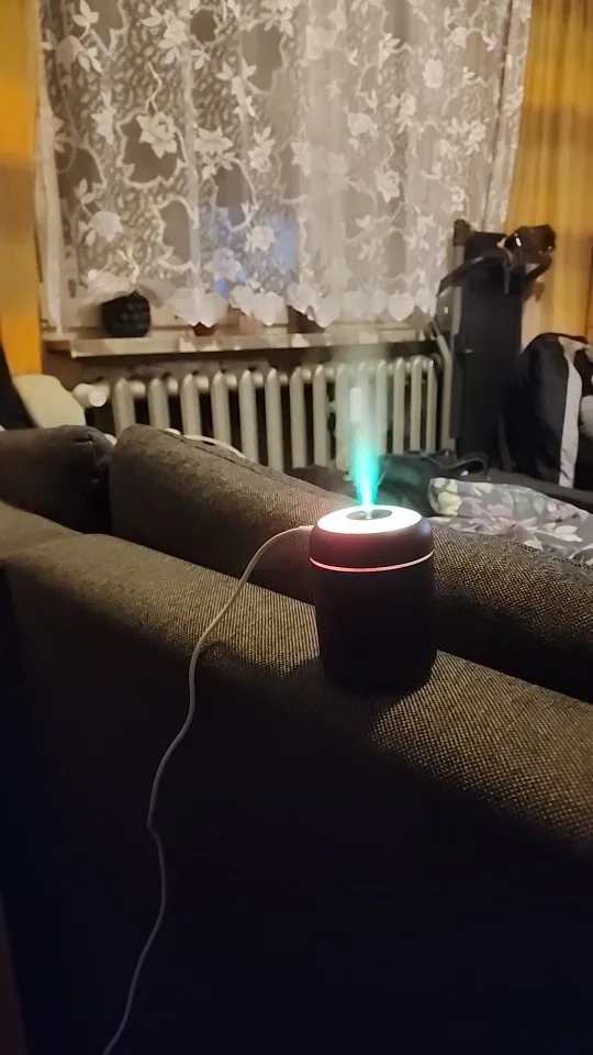The humidifier adds moisture to the surrounding air, which can reduce issues caused by dry indoor air (dry skin, dry throat, dry nasal passages) — a common benefit for mini humidifiers.